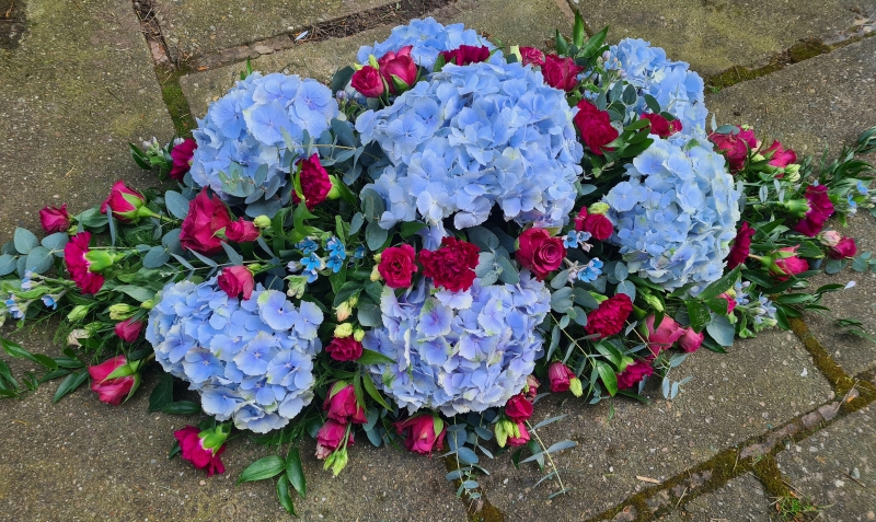 A spray of mixed flowers hand-selected by your florist in your chosen football team colours. A classic piece made to sit on top of the coffin. The most popular choice is a 4ft spray which leaves a gap at each end of the coffin but for a fuller look we recommend the 6ft spray.