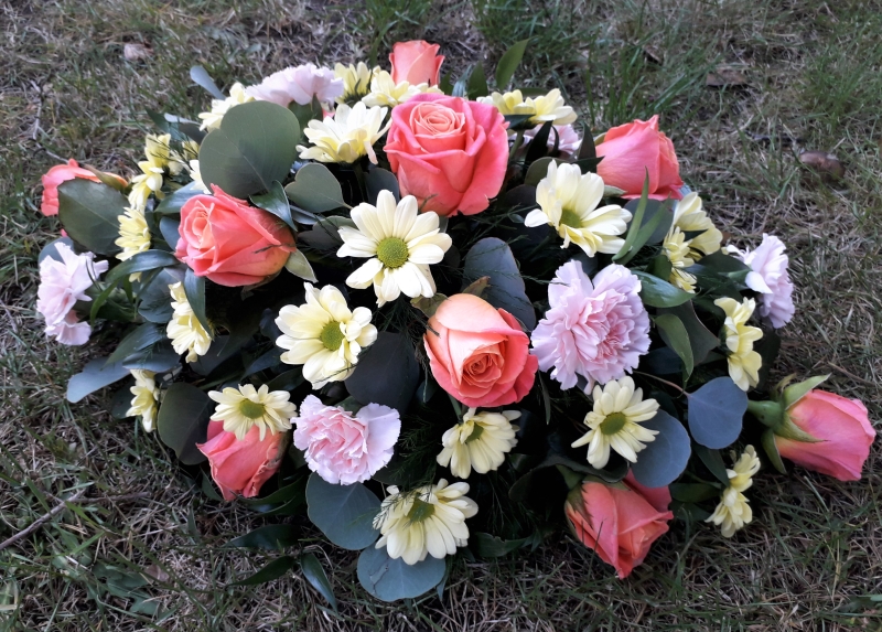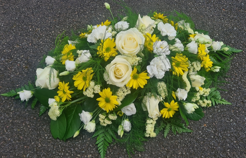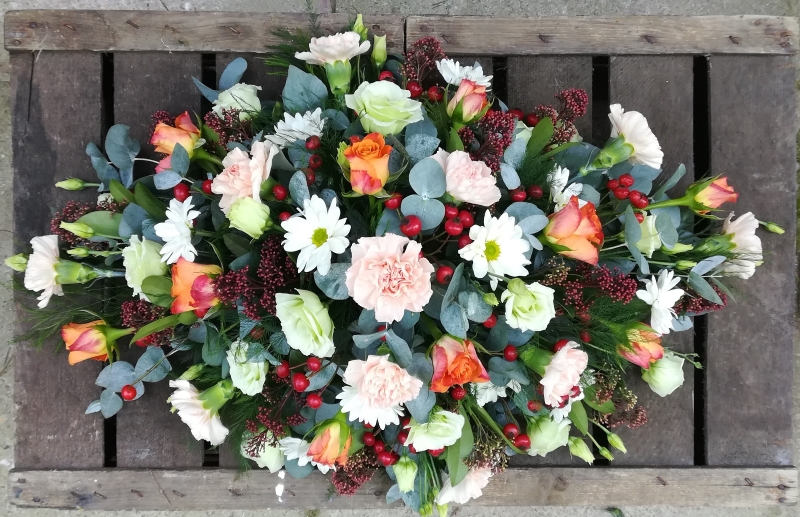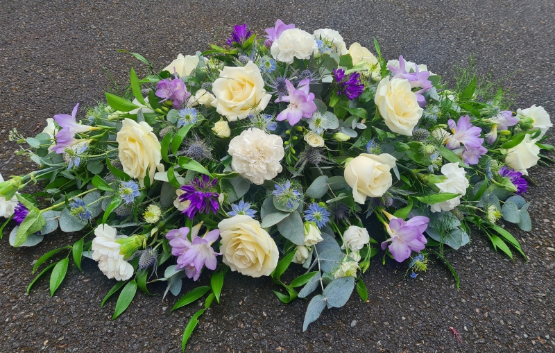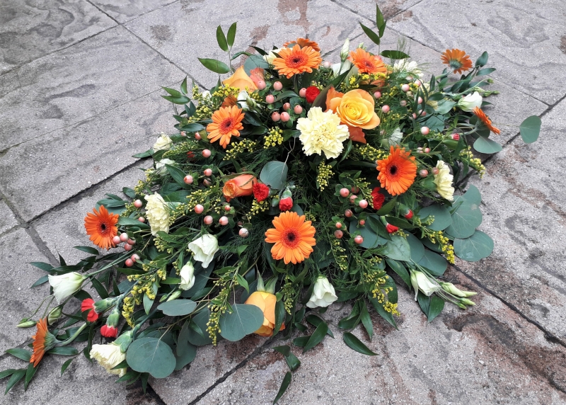 A spray of mixed flowers hand-selected by your florist in a colour scheme of your choice. Double-ended sprays are a diamond shape and can be placed on top of or alongside the coffin leaving room for other tributes as they are smaller than a coffin spray.