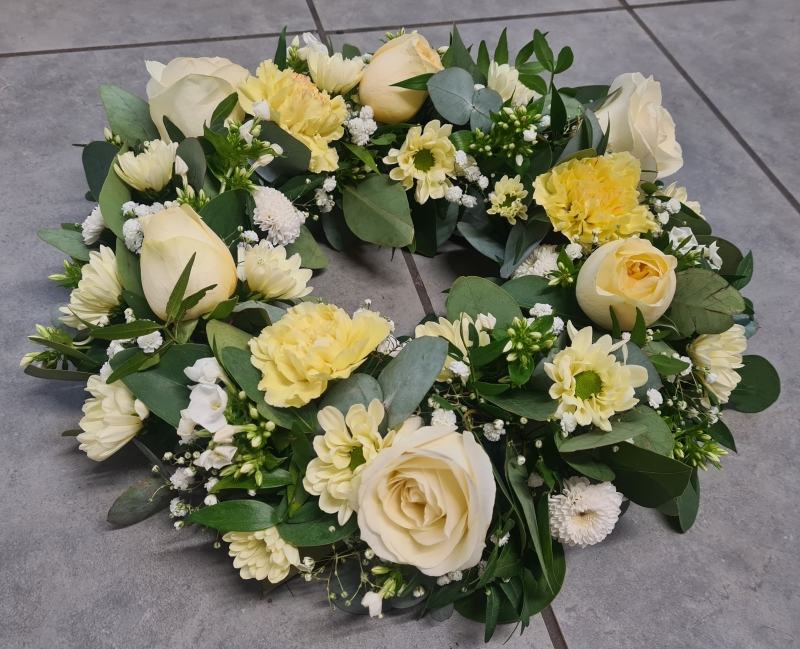A traditional funeral tribute, these wreath rings are made with a mixture of flowers hand-selected by your florist in a colour scheme of your choice. Comes in a selection of sizes and with the option to add a ribbon on.