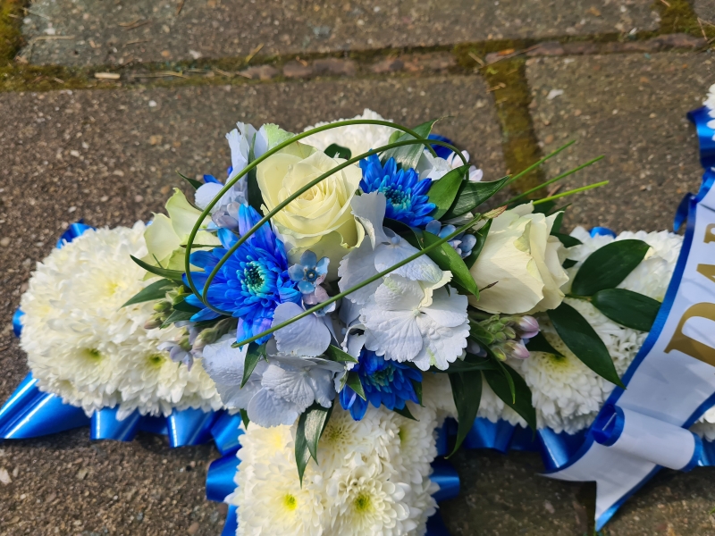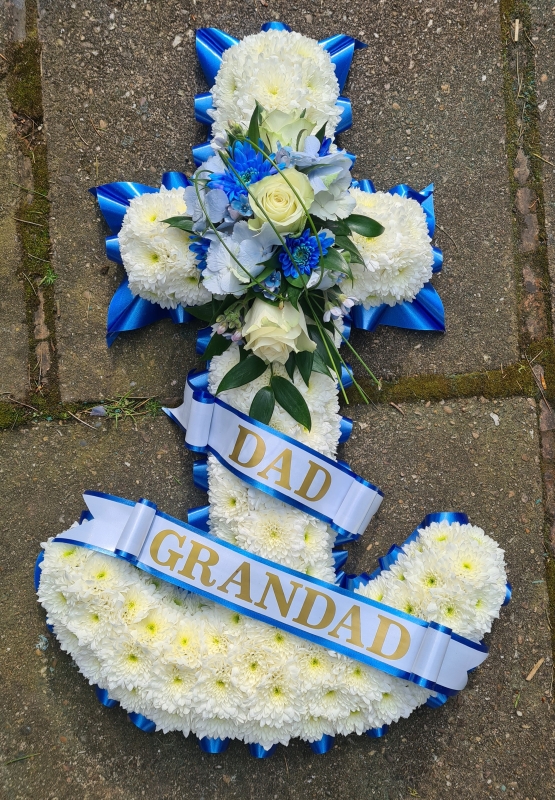An anchor made of white chrysanthemums finished with a flower spray in a colour scheme of your choice. This design comes with the option of foliage or ribbon edging. The perfect tribute for a boat lover or someone in the navy.