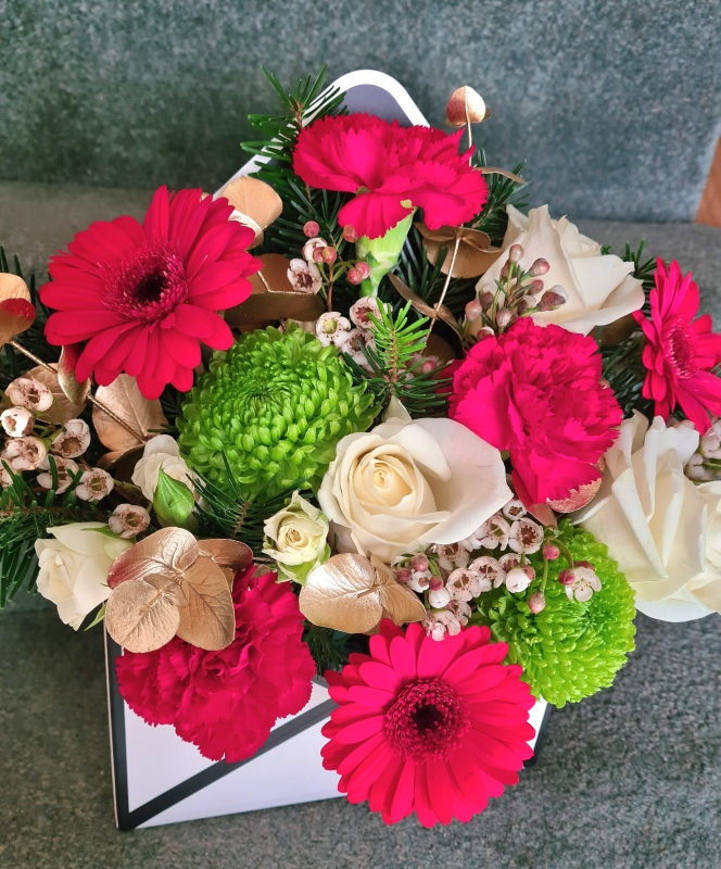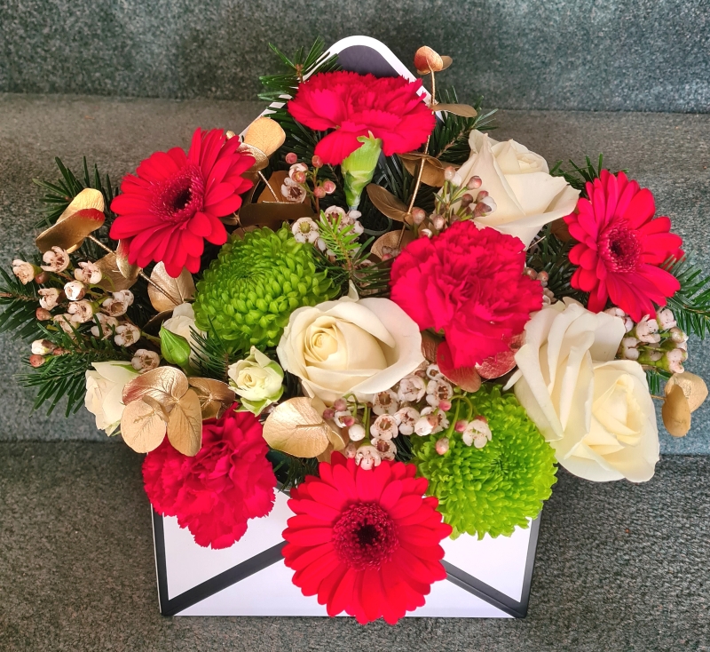 A traditional mix of colours in red, green and ivory with a hint of gold and evergreen spruce for a festive touch. This arrangement comes in a cardboard envelope and is a great alternative to a bouquet or for anyone with a small space.