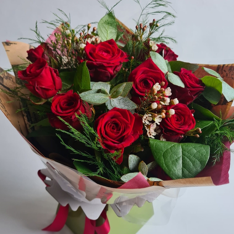 Twelve top-quality Red Naomi roses, arranged with wax flower and foliage, gift-wrapped and presented in a gift box. This arrangement comes in water. Available in other colours.