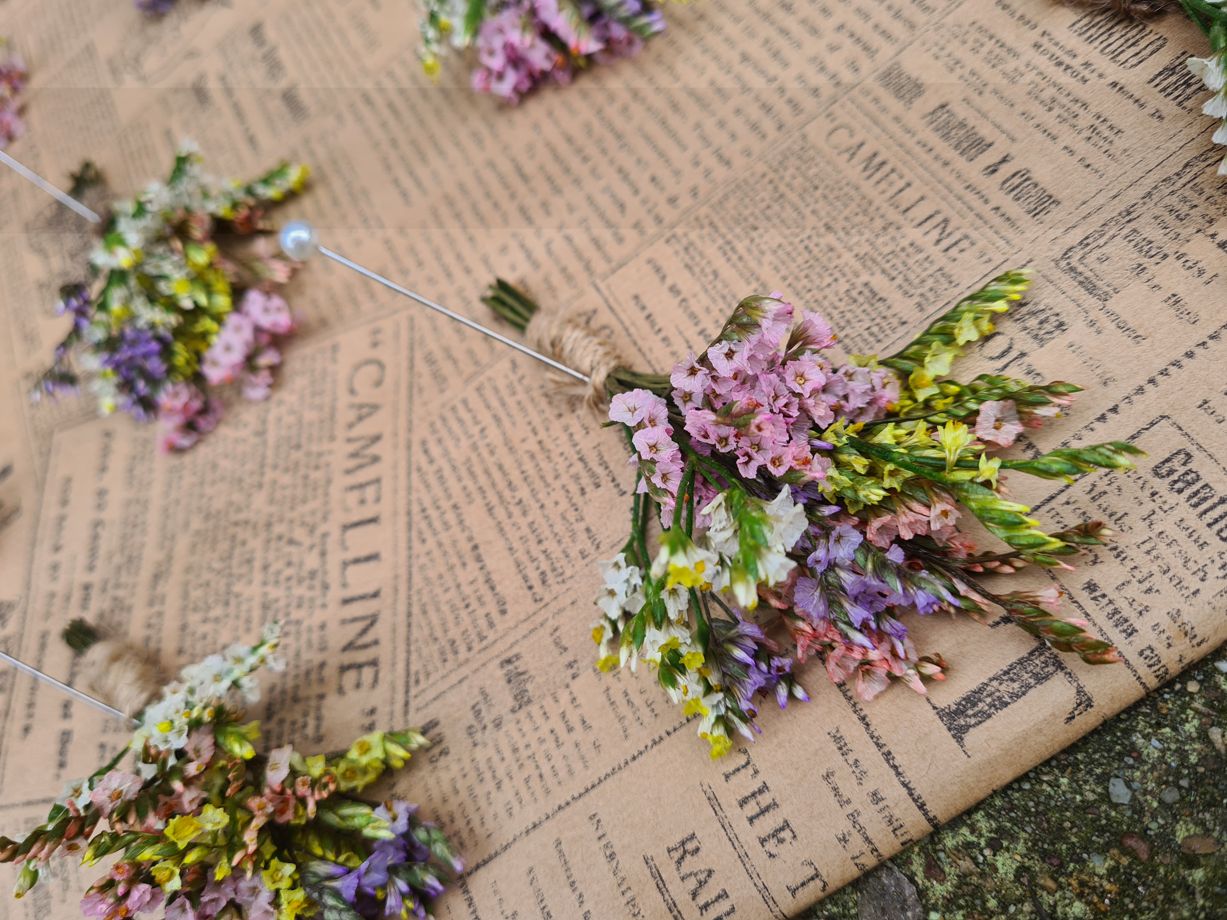Talking of dried flowers, both limonium and statice being different varieties of the same flower, have a papery like feel to them and dry out really well. They are perfect for using in dried flower arrangements and come in a fun assortment of colours including purple, pink, yellow and white. Here are some buttonholes I did for a wedding using a cluster of mixed limonium. I loved creating these and they are a great option for buttonholes as they last all day. Buttonholes being one of the first things to wilt at a wedding!