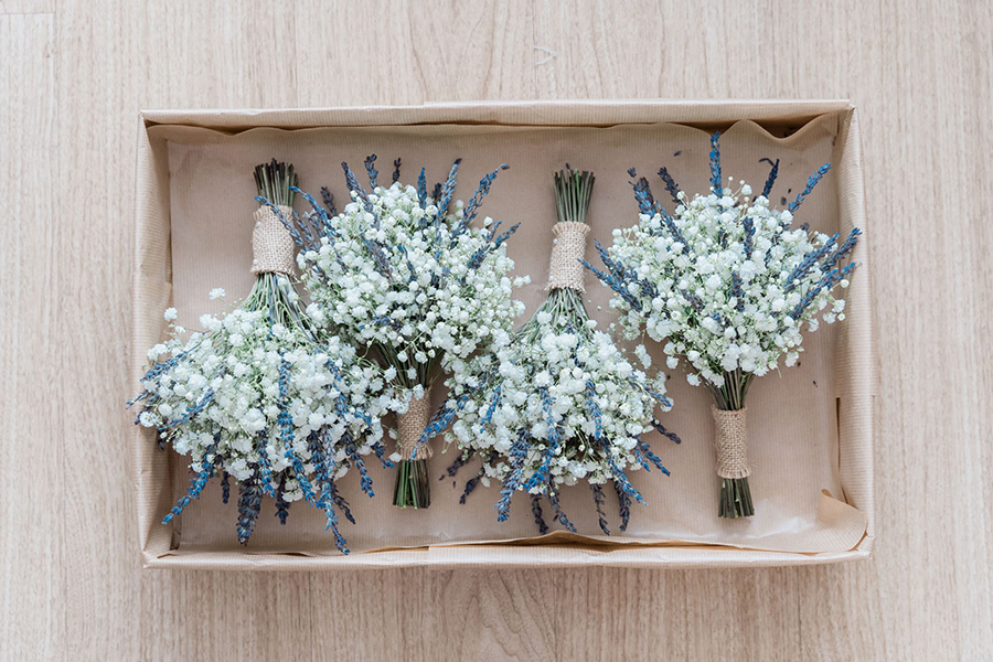 It’s all about the finishing touches so you could have the buttonholes wrapped in the same ribbon used for the bouquets or if the wedding theme is rustic, you could have the buttonholes wrapped in string.